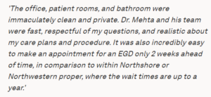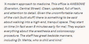 Dr. Manoj Mehta has been a lifelong Chicagoan. He grew up in the south suburbs and completed his medical school, medical residency, and gastroenterology fellowship at Rush-Presbyterian-St. Luke’s Medical Center in Chicago. While most students coveted the “private practice” residencies, Dr. Mehta elected to do rotations at Cook County Hospital to expand his exposure